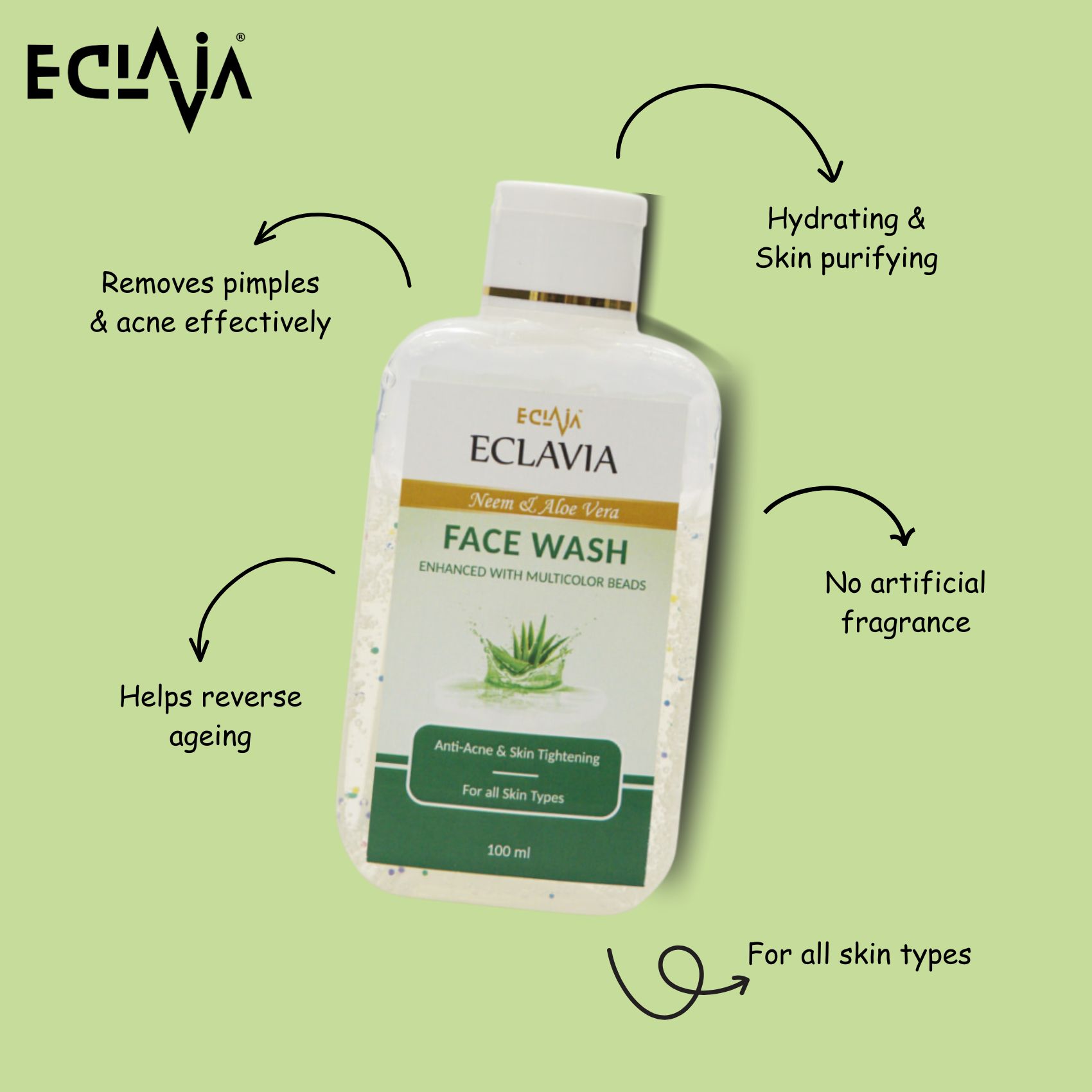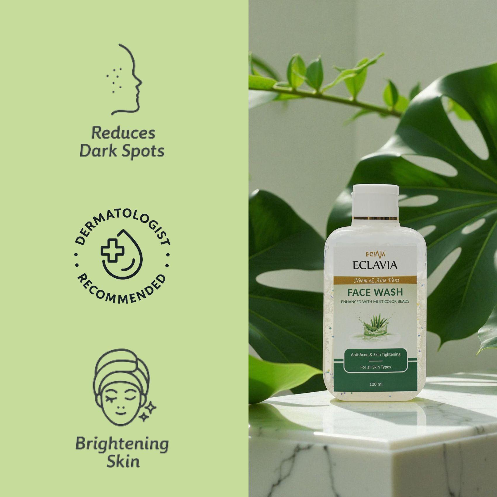 ECLAVIA Neem & Aloe Vera Face Wash is a refreshing herbal formula crafted to purify and nourish your skin naturally. Infused with powerful natural ingredients like Neem, Aloe Vera, Haldi, Rose Extract & D-Panthenol, this face wash deeply cleanses dirt, oil, and impurities while maintaining moisture balance.